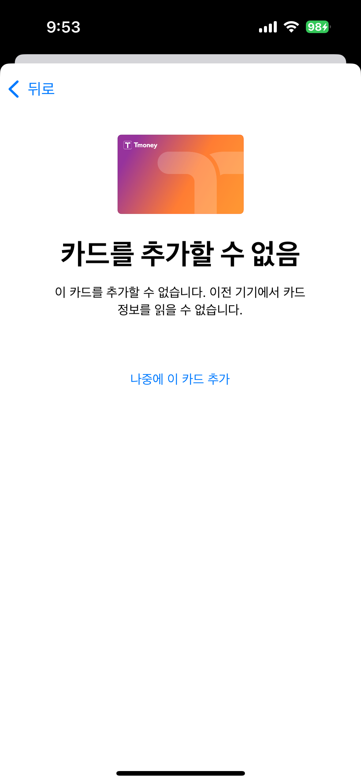 그런데 충전해두었던 티머니 카드를 이전카드에서 카드를 추가할수없다고 계속 뜹니다.