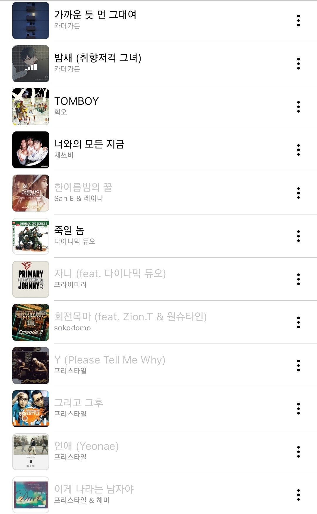 사진과 같이 보관함에 있는 몇몇 음악이 비활성화 되어 있어 임의재생을 하게되면 비활성화 된 음악이 리스트에 없어 재생이 안되고 비활성화 된 음악을 터치해도 재생이 안됩니다. 처음부터 안된건 아니고 오늘 안되기 시작했어요 왜 그런걸까요?