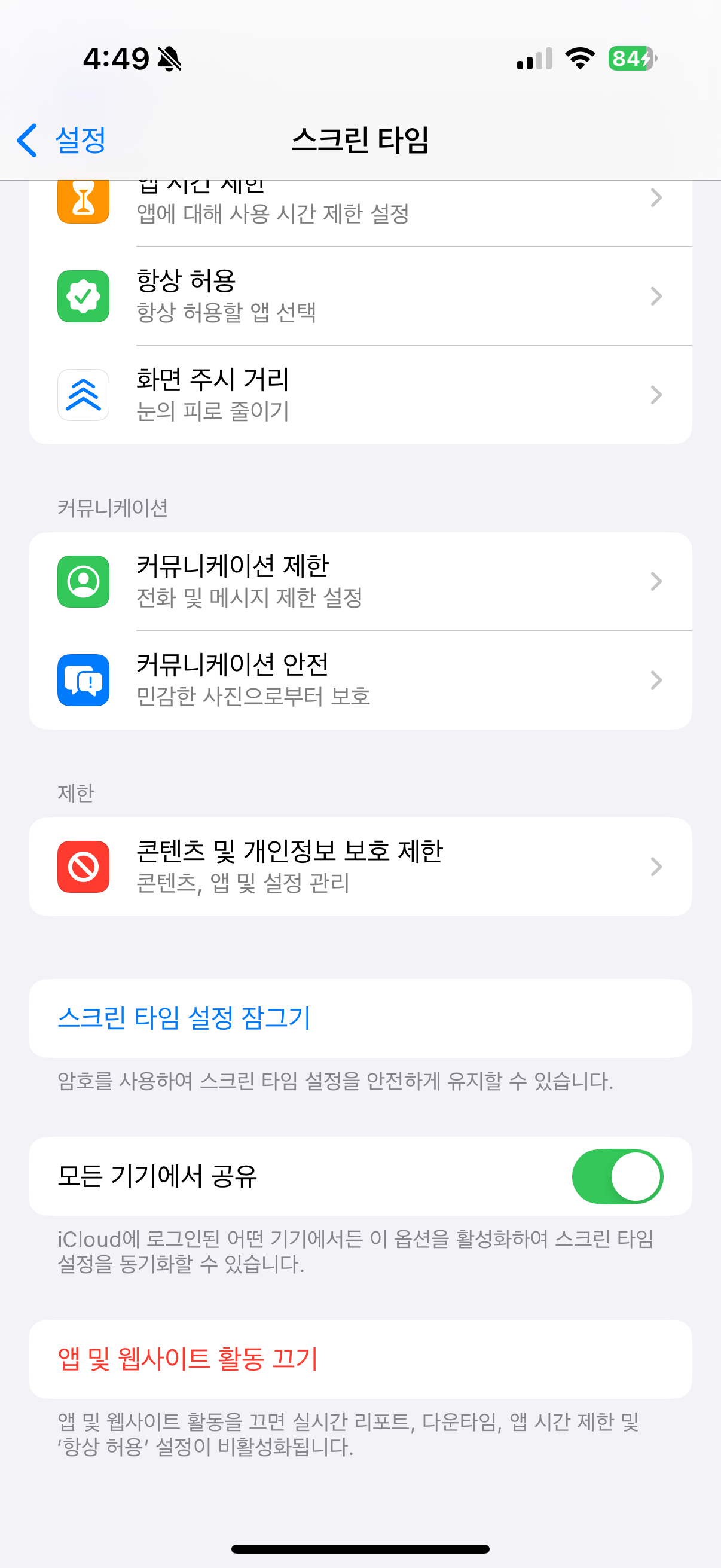 또 dkim57 님 말씀처럼 계정 관련해서 스크린 타임이 꼬일 수 있으니 가족 공유를 하고 계시다면 꺼보시고, 로그아웃 후 확인해 보셔야 할 것 같습니다.
