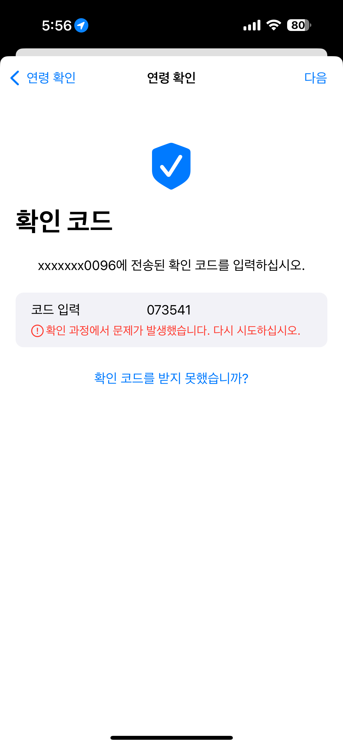 Apple 계정 연령 확인을 위한 확인 코드 입력시 오류