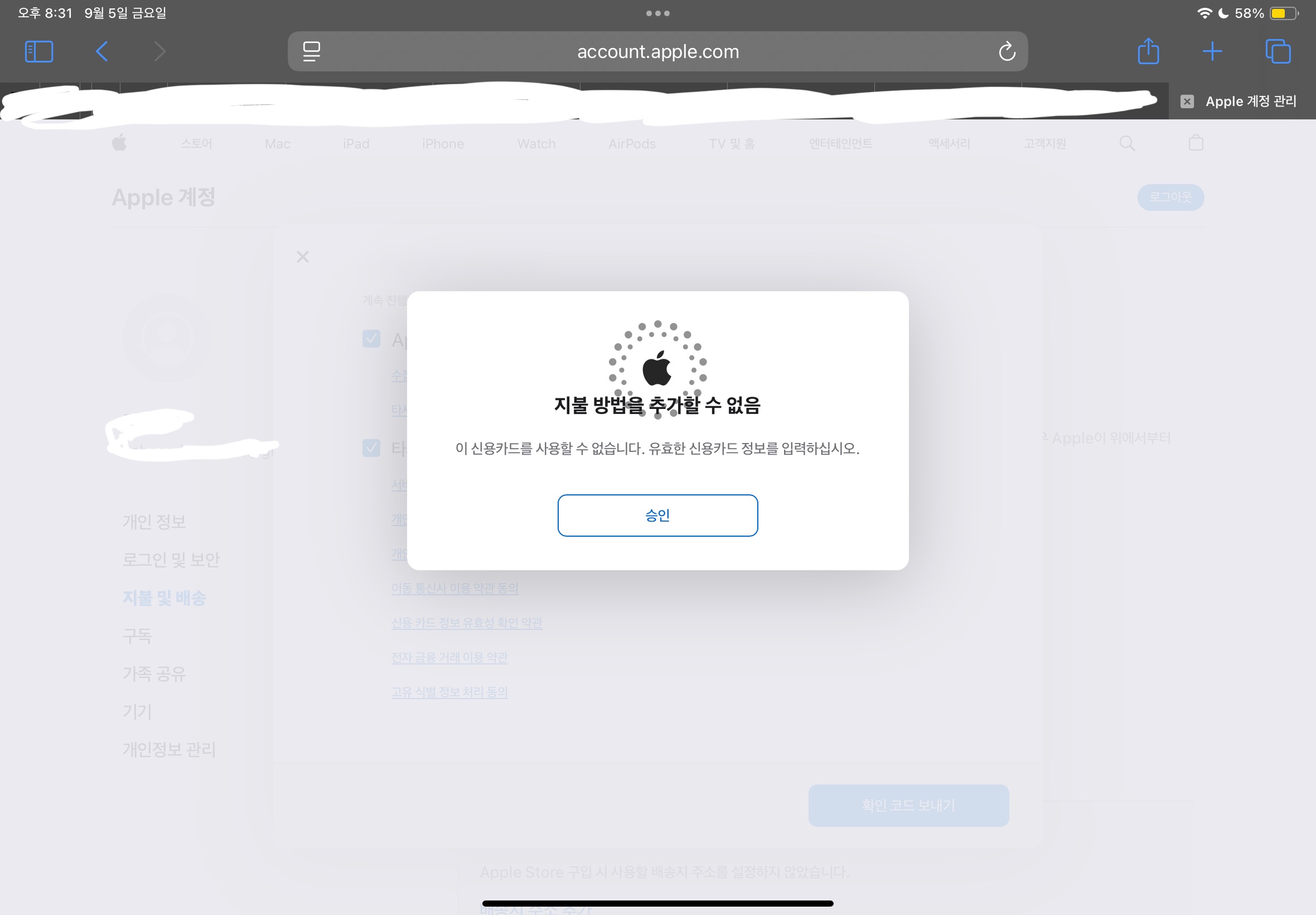 [관리자에 의해 제목이 수정되었습니다.] 기존 제목: icloud 지불 방법 업데이트가 안돼요!!!