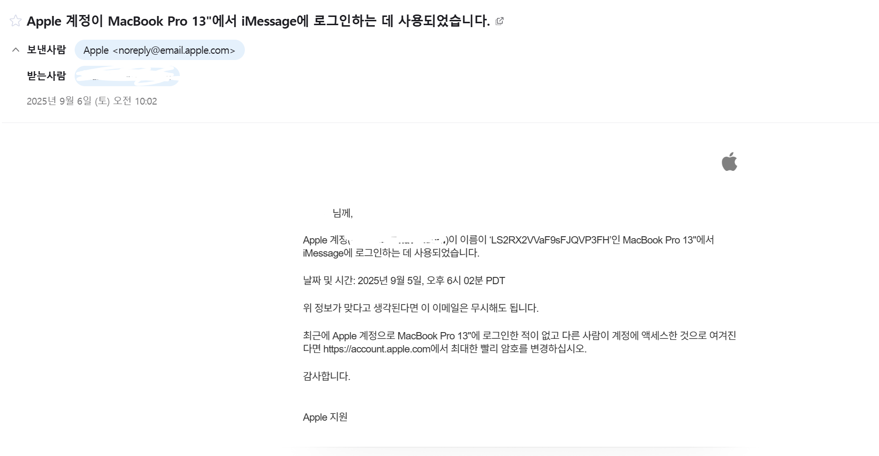 어제 저녁 다른 사람이 제 아이디로 맥북으로 imessage 로그인했다는 메일을