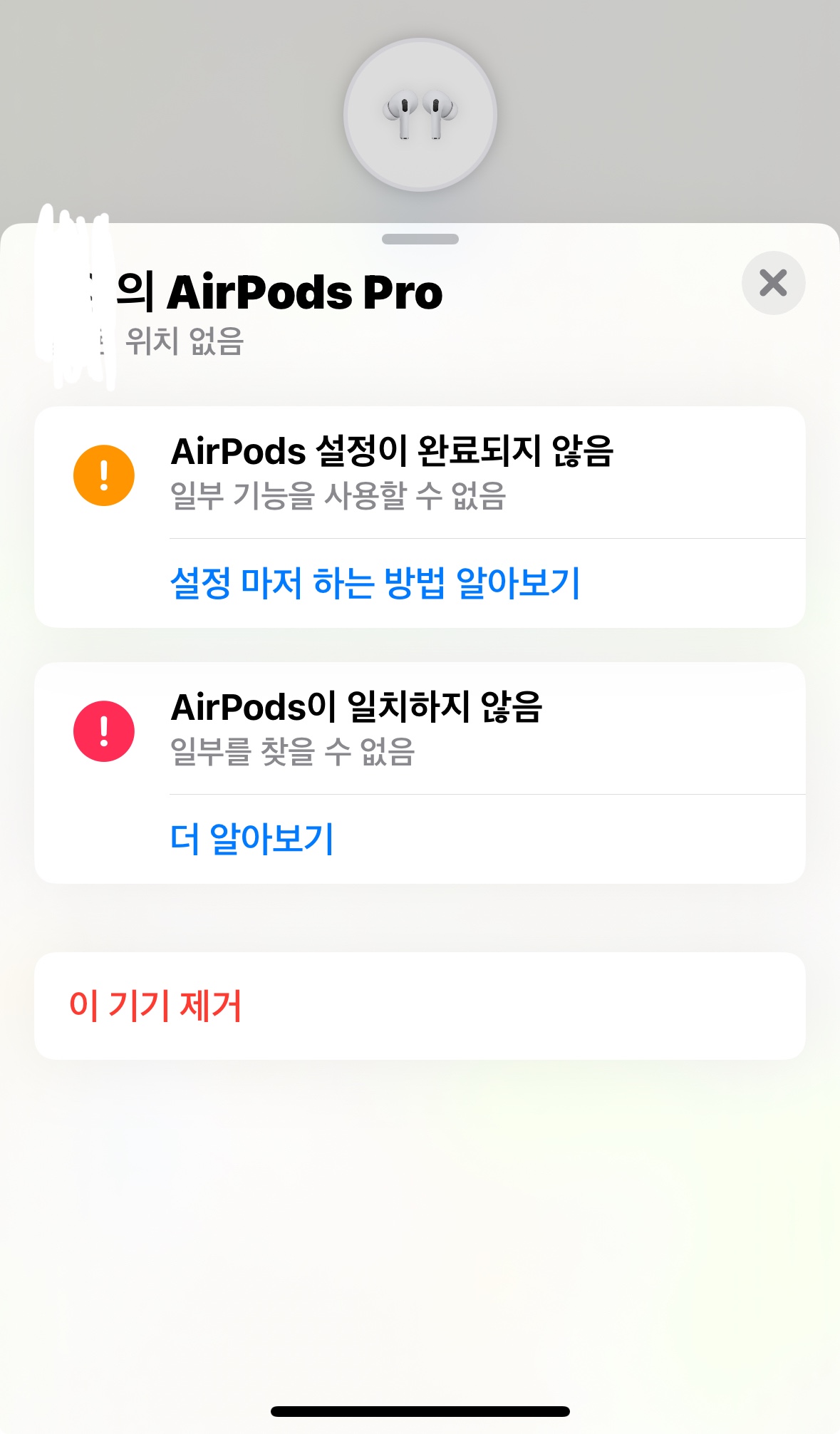 나의 찾기 앱에서 AirPods Pro 설정이 완료되지 않음 표시