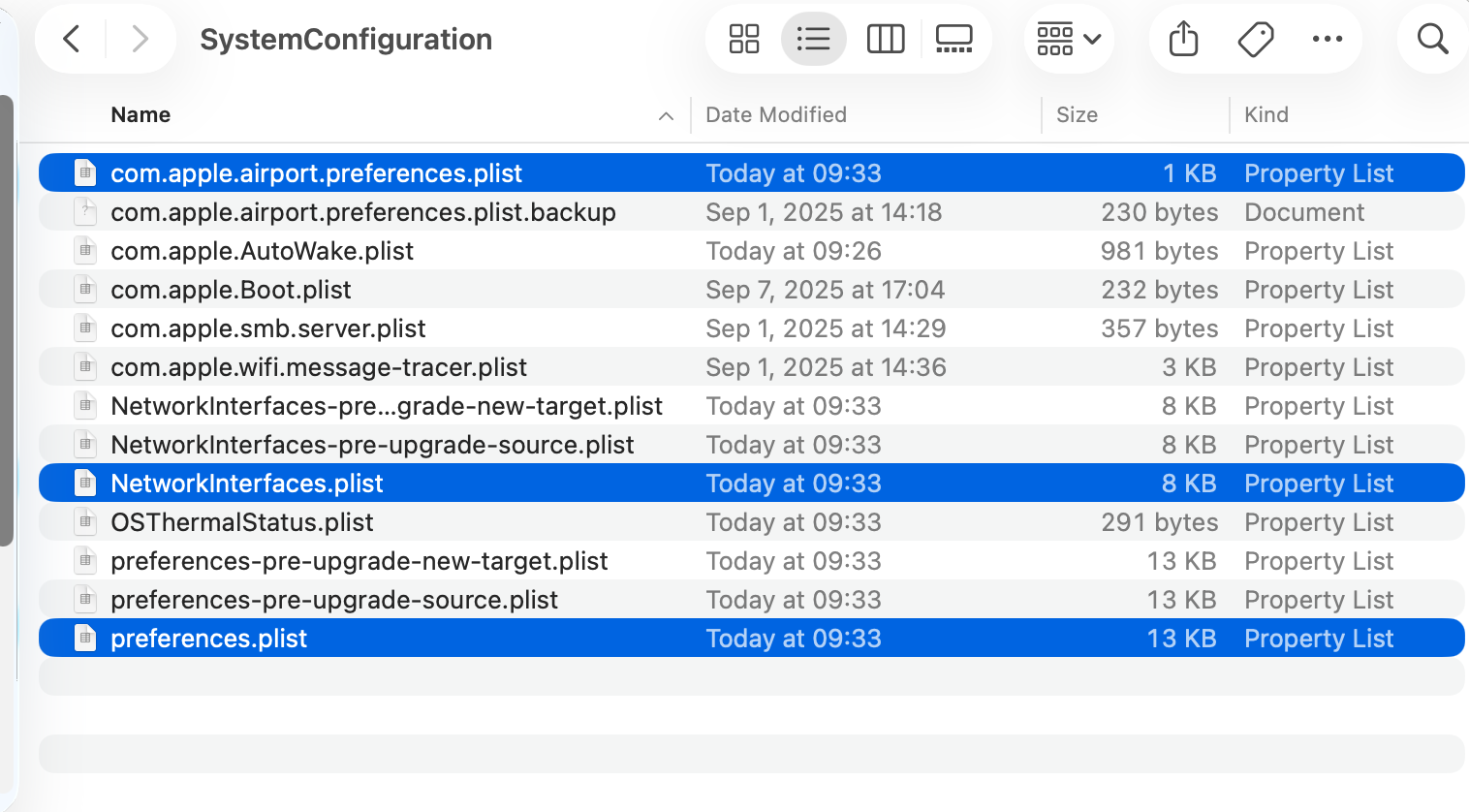 Finder 실행후 cmd + shift + G 를 눌러 /Library/Preferences/SystemConfiguration/ 입력 후 엔터 아래 파란색으로 표시된 파일 및 적어놓은 파일이 있다면 다른 곳으로 옮긴 뒤 재부팅 해보시기 바랍니다.