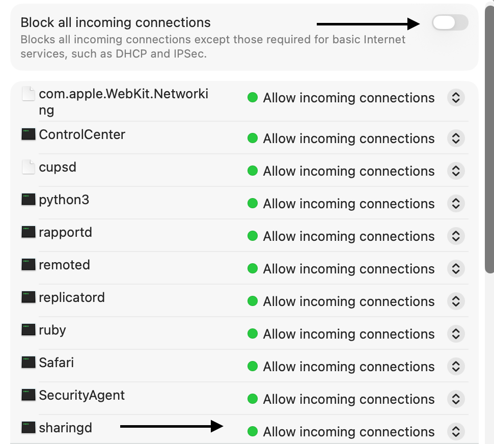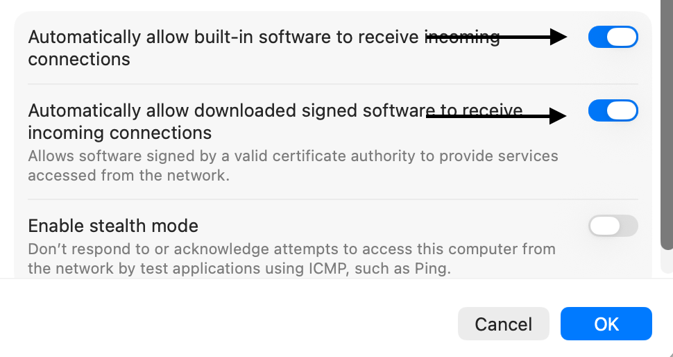 Mac 설정 > 네트워크 > 방화벽 > 하단의 옵션... 에서 이렇게 설정되어 있는지 확인해 보시기 바랍니다.