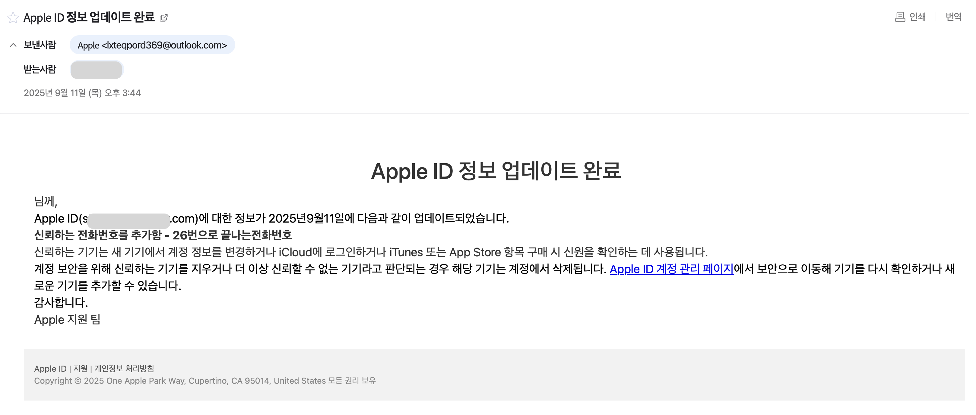 기존 제목: 애플 사칭 스미싱으로 의심되는 메일을 받았는데 확인 부탁드립니다