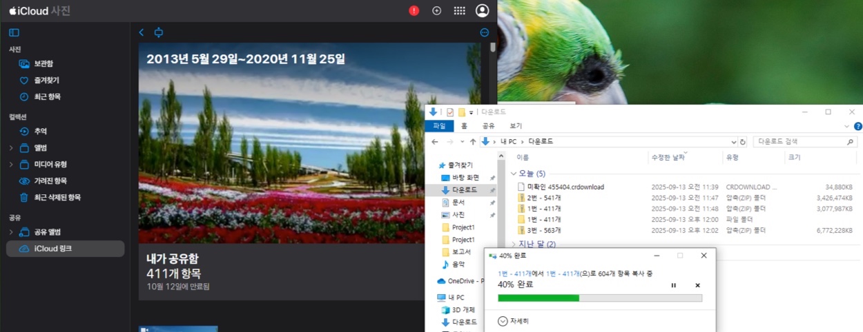 아이클라우드에 저장된 1000장이 넘는 사진을 기기에 저장하려고 합니다.