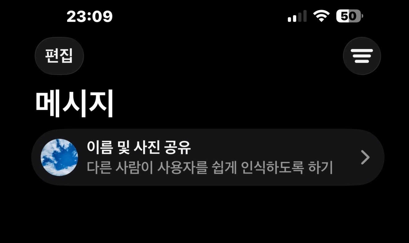 메시지, 전화, 연락처 앱에서 ‘이름 및 사진 공유’ 항목에 들어갔다가 나오면