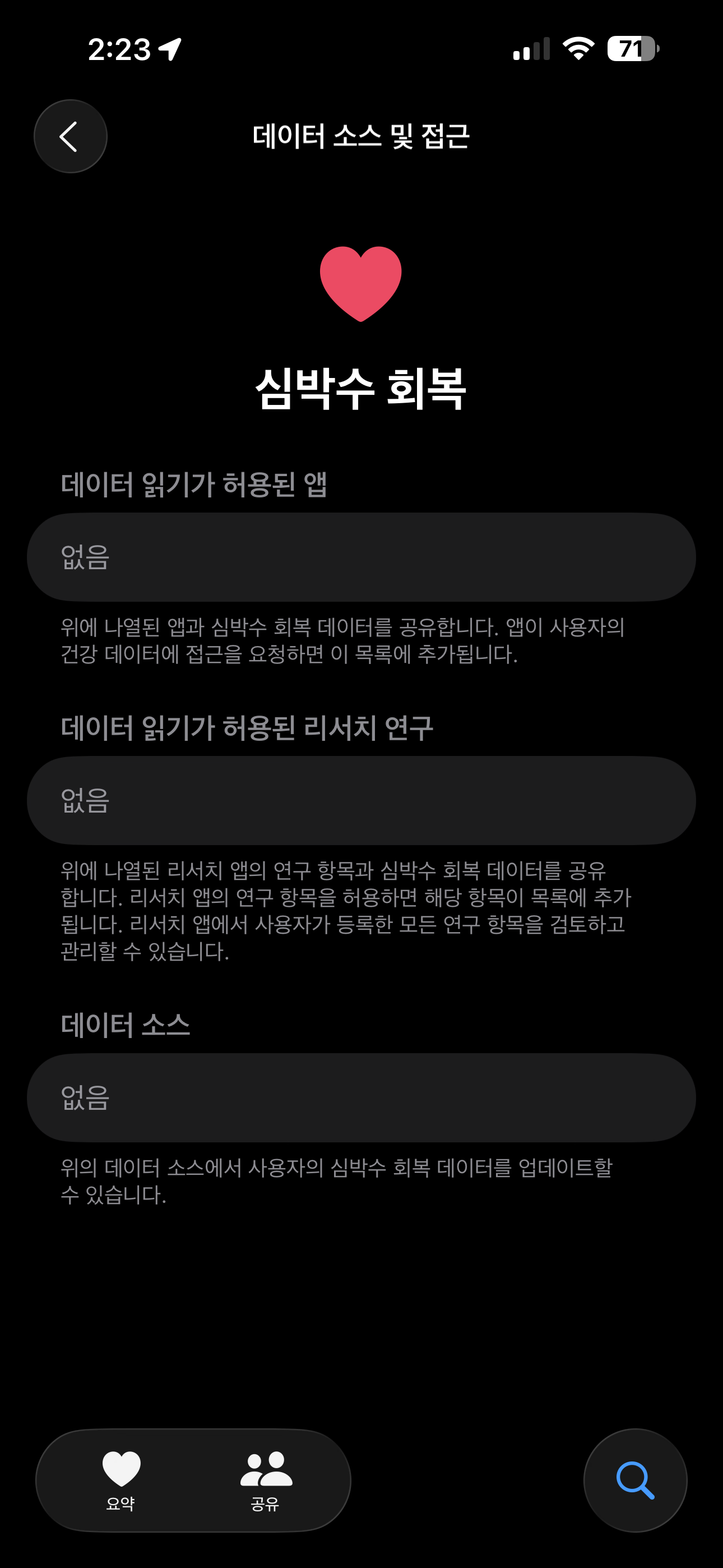 데이터 기록 및 수집 데이터가 없는 나의 건강앱 심박수 회복 데이터 소스란에는 애플워치를 사용하고 있음에도