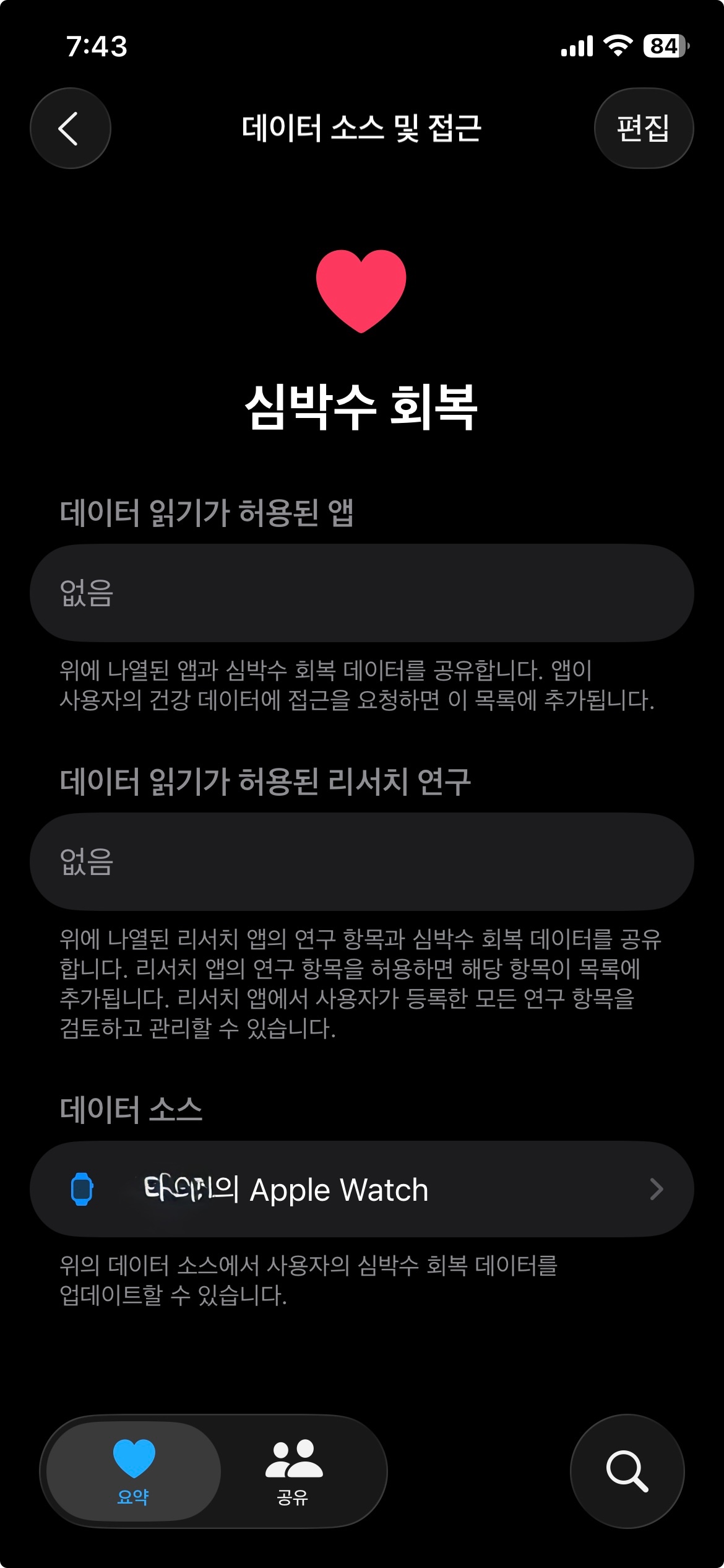 애플워치 건강앱에서 심박수 회복 데이터 소스 기기 없음