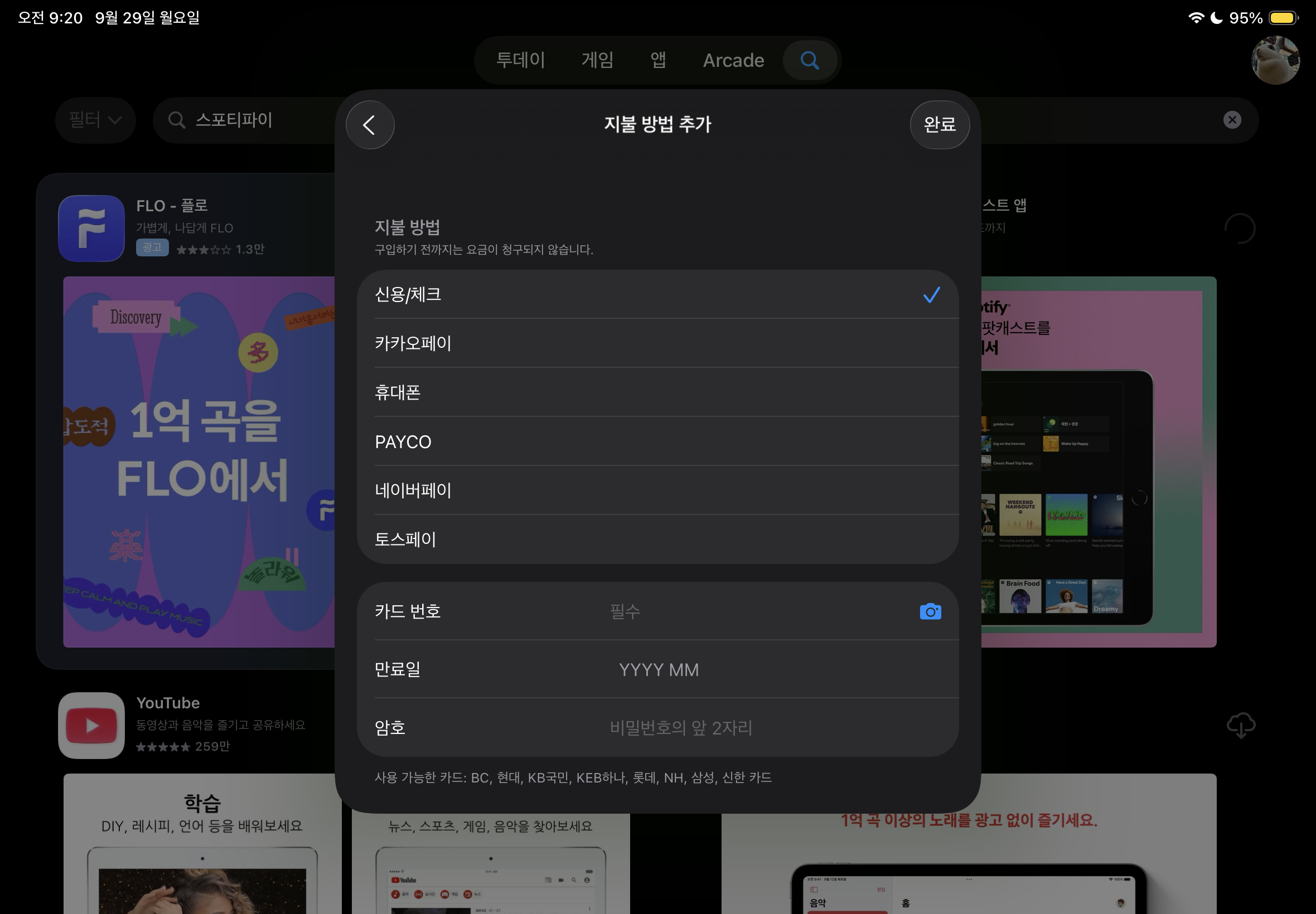 iPadOS 26 업데이트 이후 무료 앱 설치시 지불 방법을 추가하라는 화면 표시됨