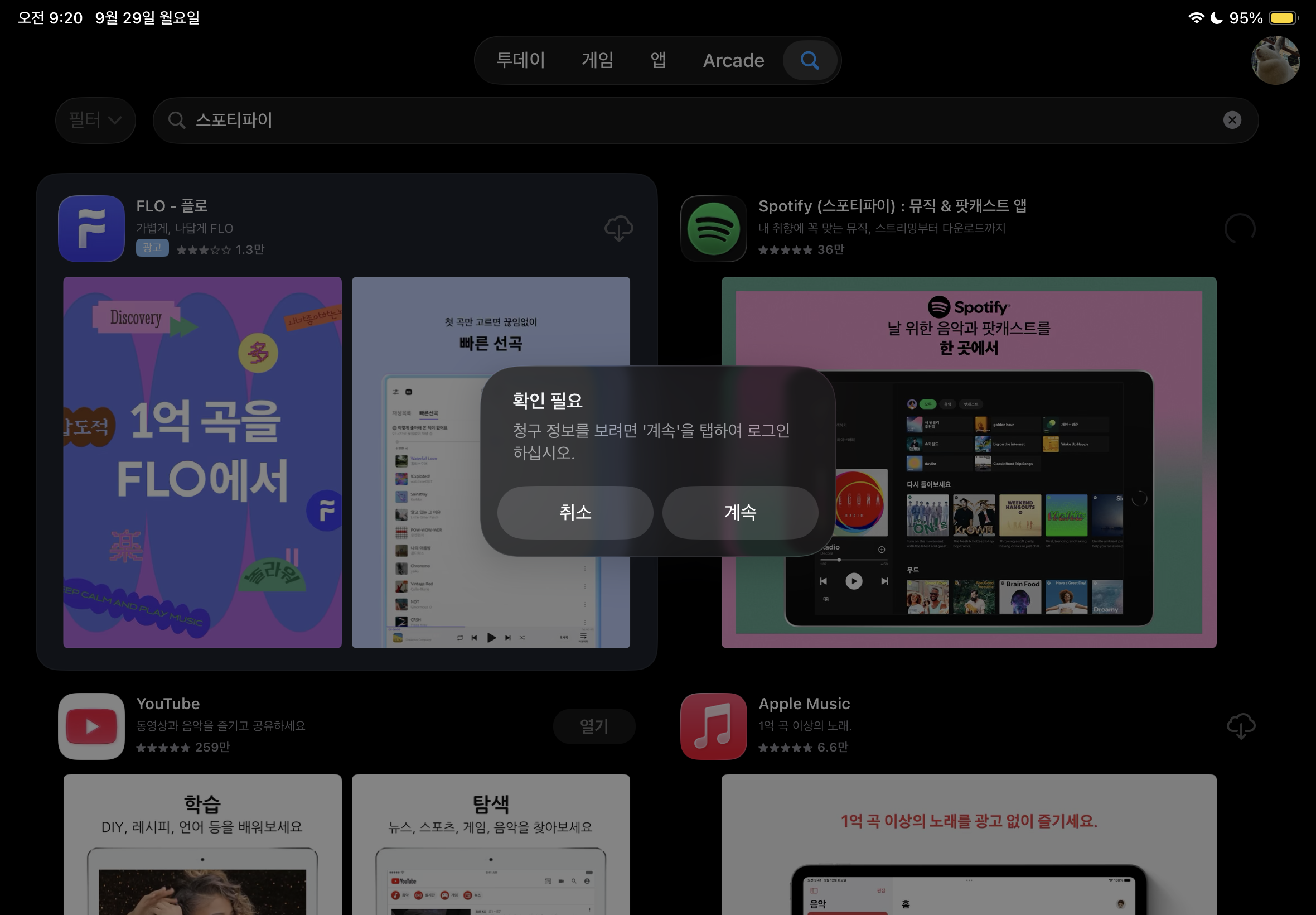 무료 앱인데도 불구하고? 설치하려고 한 앱은 스포티파이입니다.