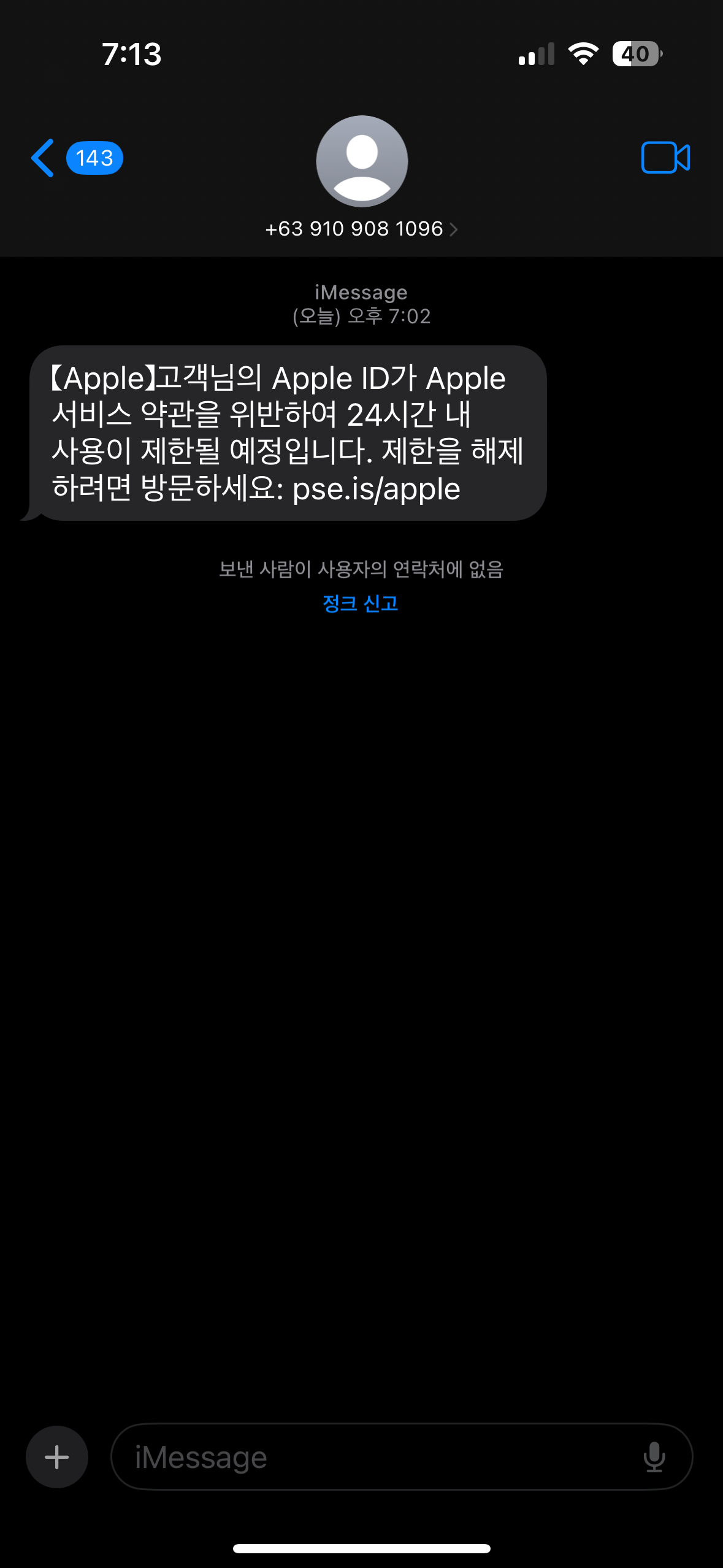 Apple을 사칭한 피싱 메시지인지 확인 문의