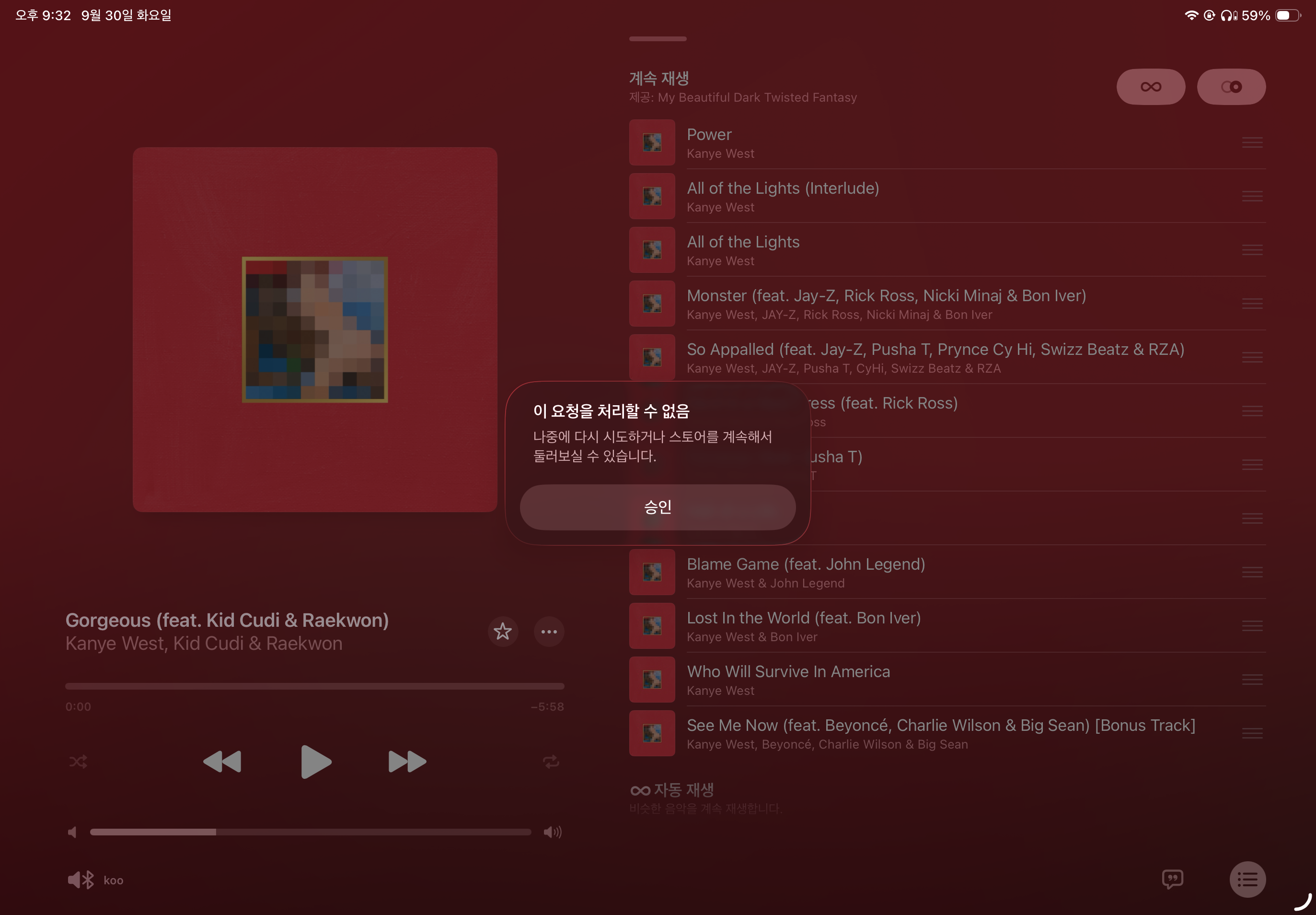 Apple Music에서 음악 재생시 '이 요청을 처리할 수 없음' 문구 표시됨