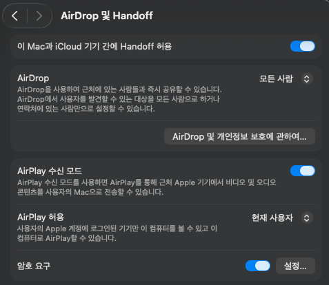 위의 에어드랍 및 핸드오프를 설정한점 참고 해주시면 좋을 것 같습니다.
