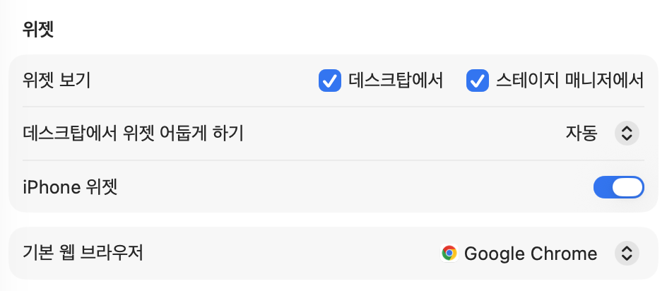 참고로 Mac 설정 > 데스크톱 및 Dock > 위젯 부분에 iPhone 선택할 하는 란에