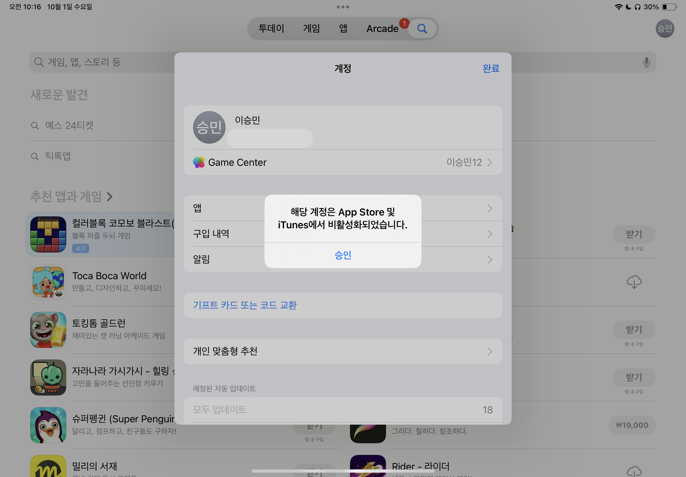 App Store 계정 비활성화됨