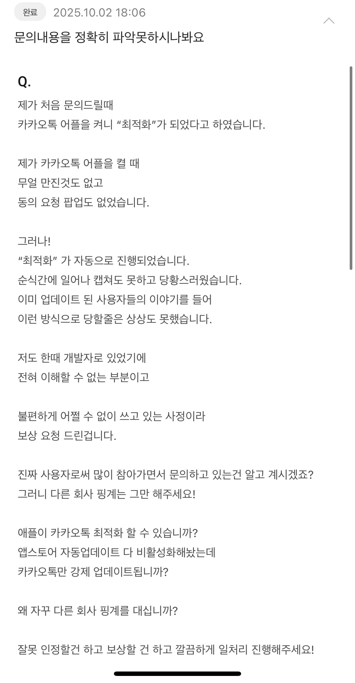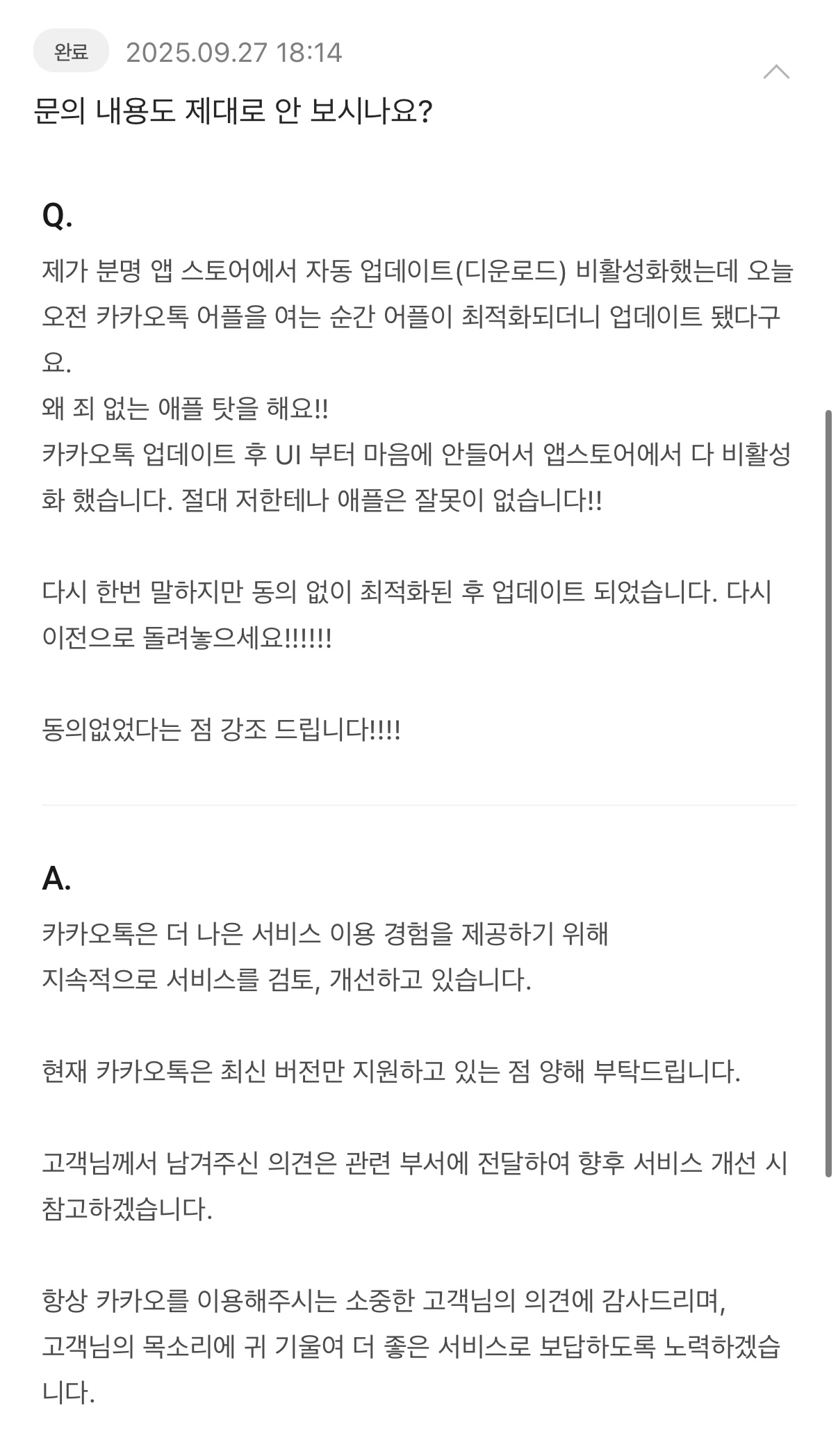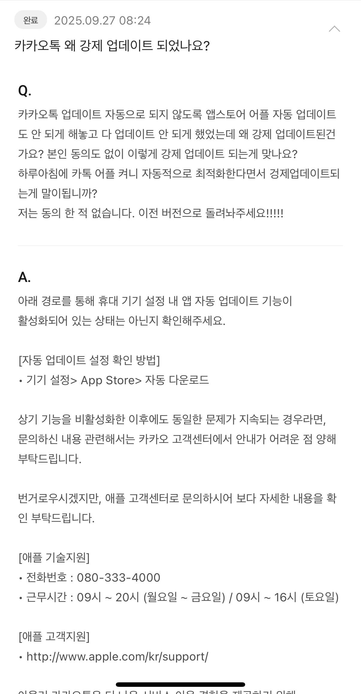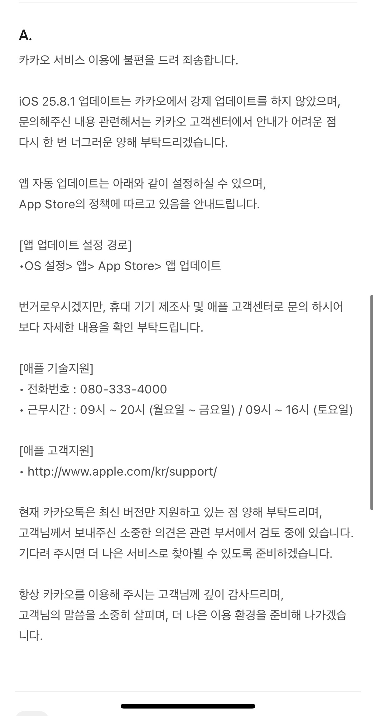 그러나 카카오톡 측은 강제 업데이트는 안 한다며 책임을 회피하고 계속 애플 기술 및 고객지원센터를 안내해주고 있습니다.