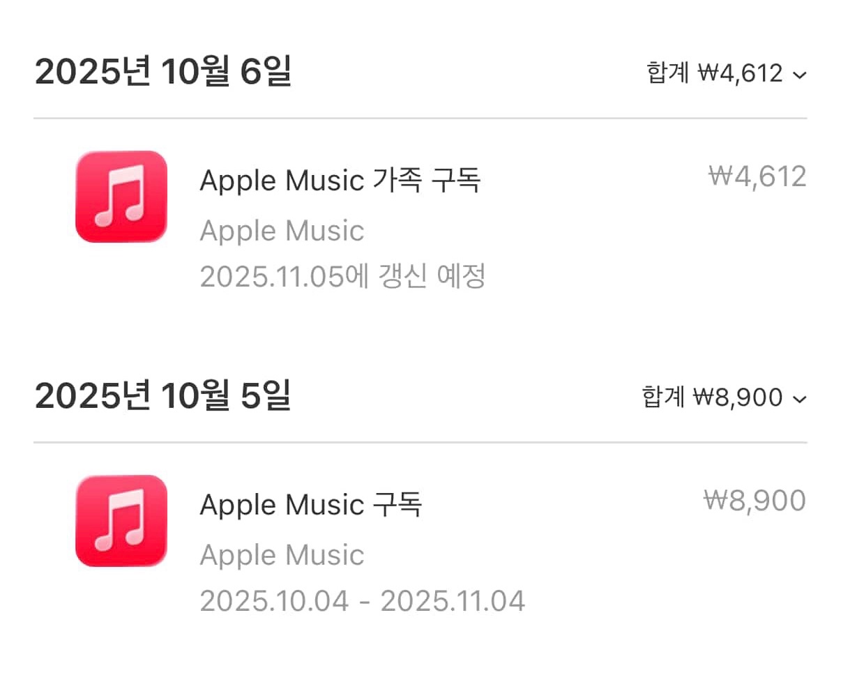 제가 원래 8,900원짜리 요금제를 쓰고 있었는데 이번달에 그 요금제가 결제가 된 후 요금제를 업그레이드 시키려고 13,500원짜리 가족 요금제로 바꿨어요.분명 결제 당일에는 4,612원만 빠져나갔는데 자고 일어나보니 애플뮤직에서 4,900원이 더 결제가 되었어요.이게 왜 그런건지 알려주세요ㅠㅠ