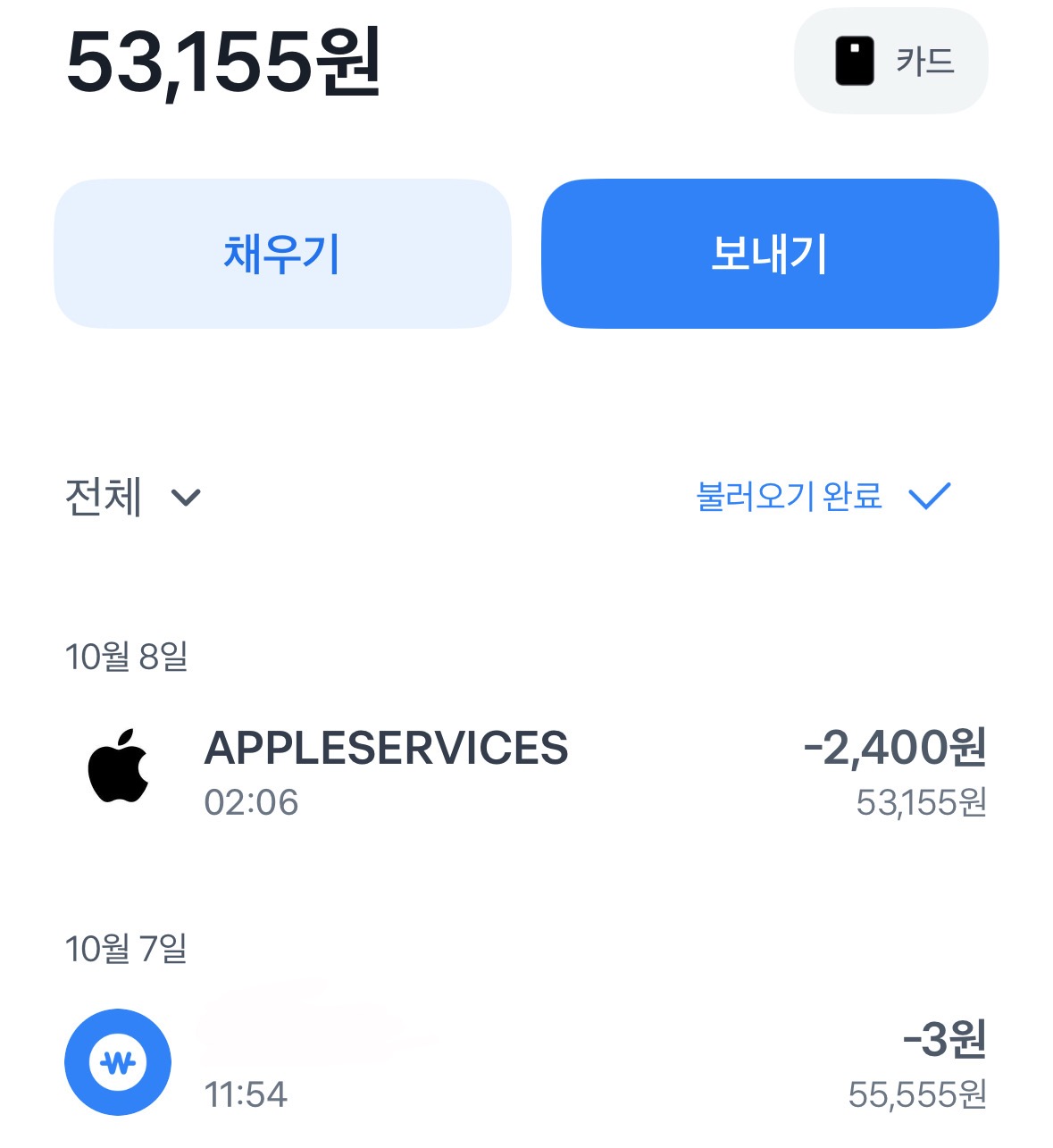 원래 2400원 정도를 넣고 다시 가져가는 식으로 확인? 을 하는 것 같았는데 이번엔 빼가기만 했어요.. 그래서 확인하려고 애플스토어에 갔는데 내역에도 없더라고요.. 제가 기분좋게 55,555로 가격을 맞춰놨는데, 우울해졌어요.. 아직 학생인지라 2400원도 진짜진짜 소중한 돈이라 문의드려봐요. 왜 빠져나간건지? 만약에 정말 오류가 맞다면 환불받을 수 있는지 여쭤봅니다. 도와주세요ㅠㅠ