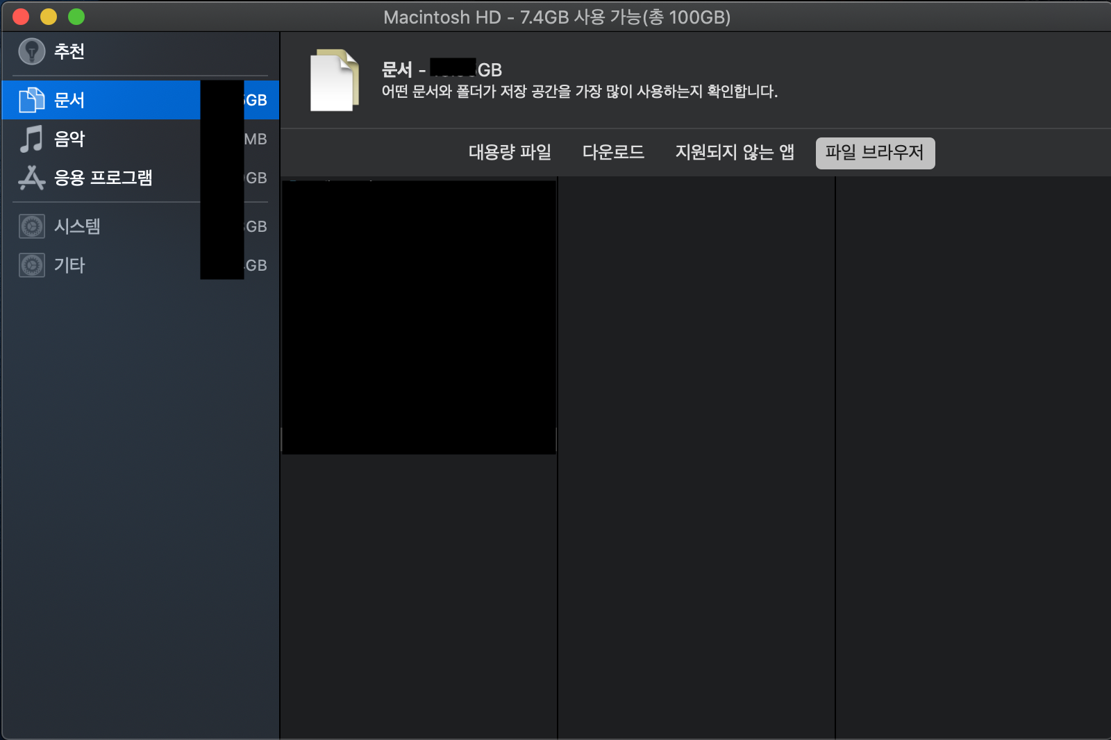 그런데도 노트북 소프트웨어 업데이트에 들어가서 업데이트를 누르니까 20GB인가 정도 부족하다고 하더라고요. 그래서 시스템 환경설정 내 Apple ID 들어가 보니까 2TB만큼의 저장공간이 남아 있다고 표시되어 있는데, 노트북 내 저장 공간 관리 앱에 들어가니까 100GB 중 7GB 정도인가 사용 가능하다고 떠 있더라고요..