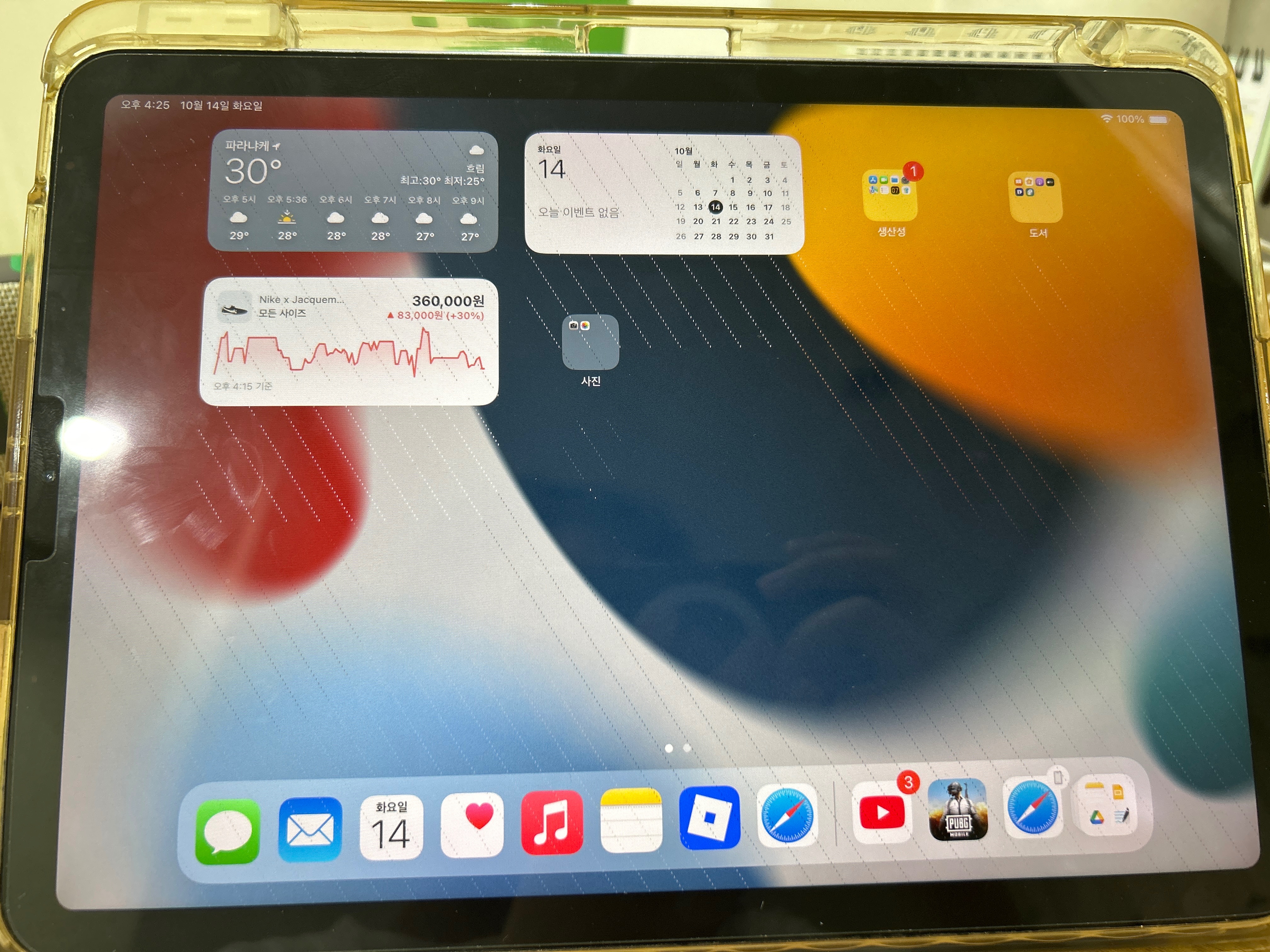 iPad 강제 재시동을 해보시고 문제가 계속되면 디스플레이 또는 GPU 쪽 문제일 수 있어 하드웨어 점검을 받아 보시기 바랍니다.