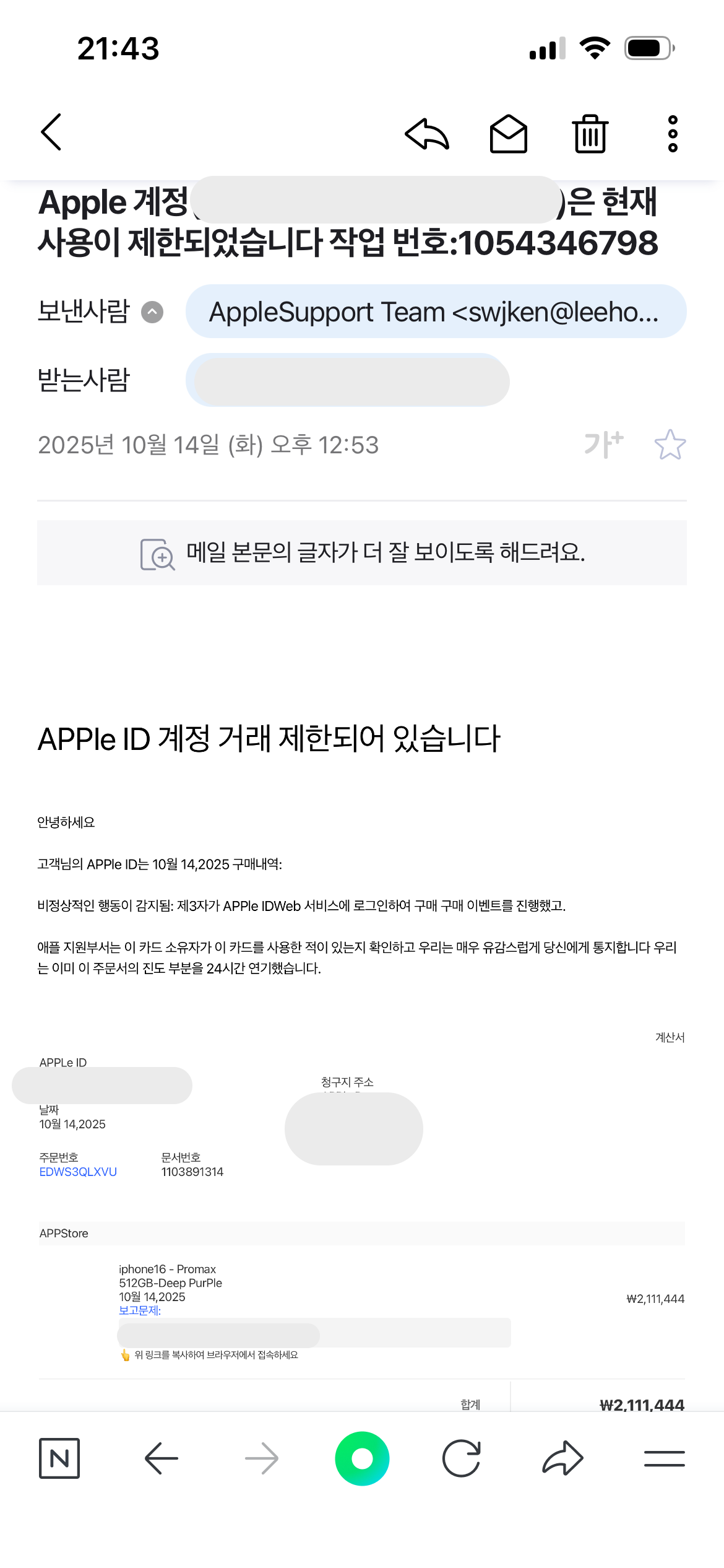 다음 사용자의 사용자 프로파일: MindBlown MindBlown 사용자 레벨: 레벨 6 15,384 포인트 혜진249 님에게 답변 2025. 10. 14 오후 06:46 안녕하세요!발신자 주소를 보니 스팸 100%입니다. 삭제하시기 바랍니다. 감사합니다.도움이 되셨다면 하단의 ⬆️ 버튼 한번씩 눌러주시면 감사하겠습니다. 답글 링크
