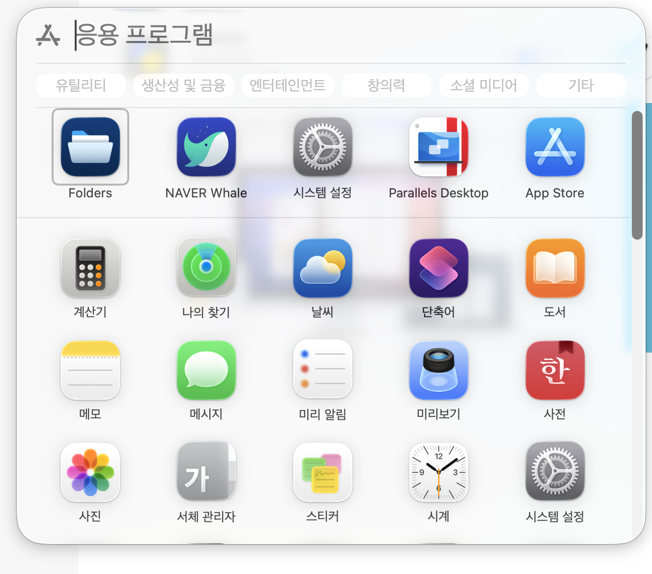 macOS 26으로 넘어오면서 폴더별로 정리가 가능한 런치패드 기능이 삭제되어 따로 폴더별로 정리하거나 하는 기능은 제공하고 있지 않습니다. iPhone 오른쪽 끝 앱보관함처럼 Apple 내부적으로 구분한 카테고리형식으로만 보여지게 됩니다.