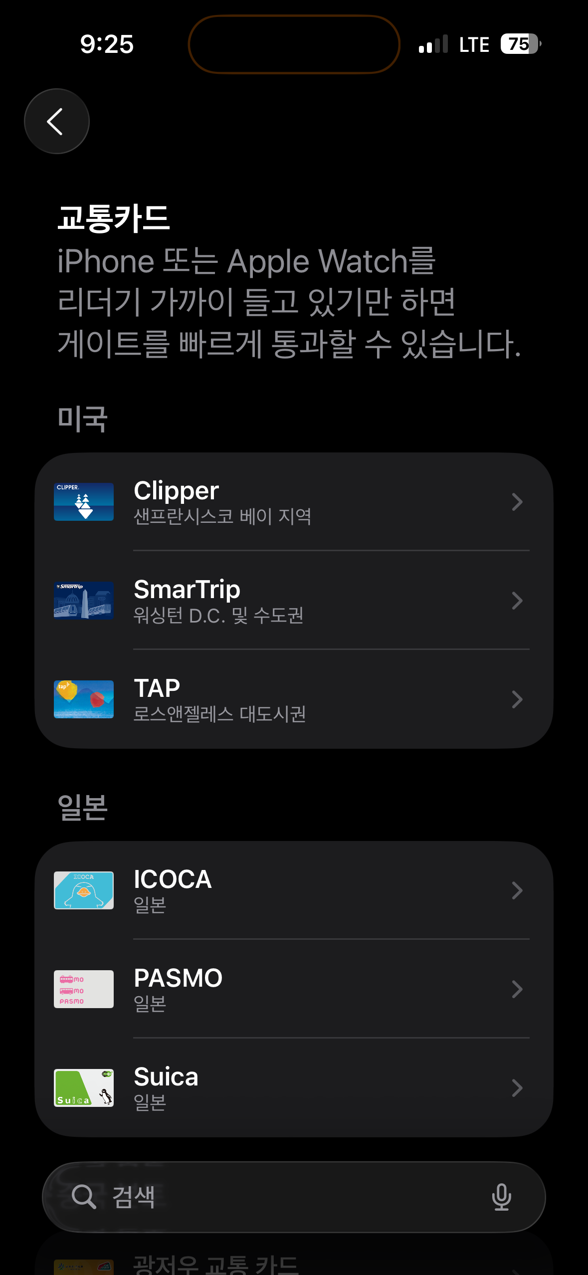 그래서 워치-지갑-카드추가-교통카드를 누른 화면에서 티머니를 찾으려고 했는데 찾을 수 없었습니다.