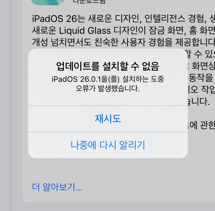 iPad 저장공간에서 iPad OS 26.0.1 파일이 있다면 지우고 다시 시도해 보시기 바랍니다.