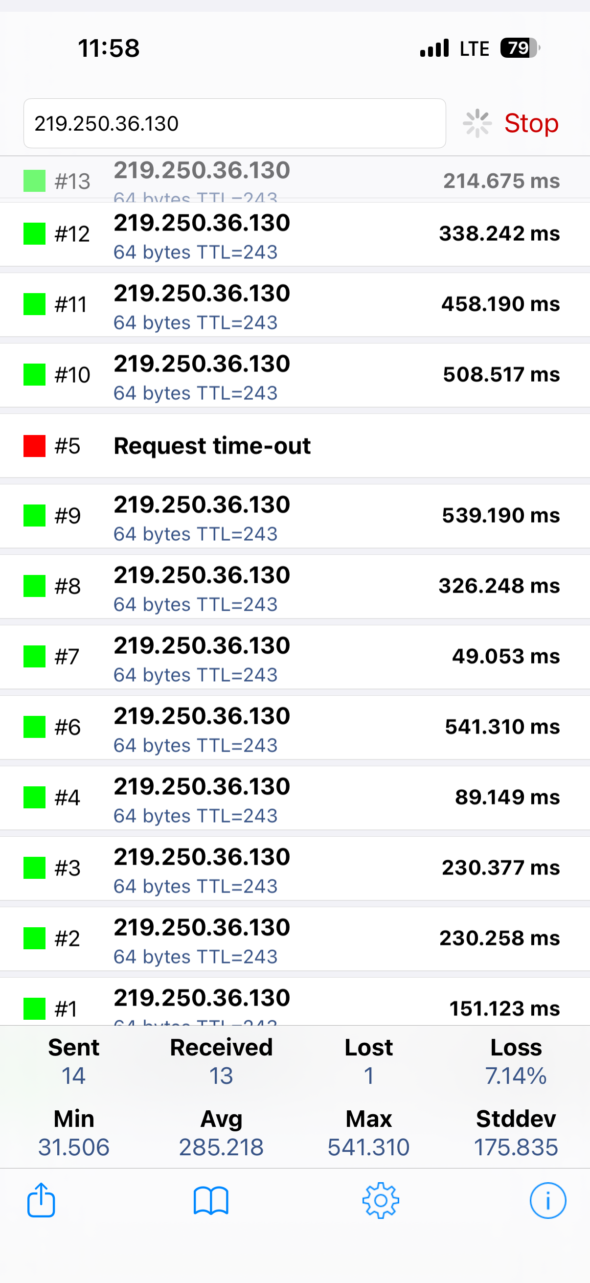 Apple이 명확히 원인을 알려주진 않았지만 올려주신 Ping 결과값만 보면 C-DRX관련 문제로 보입니다. C-DRX는 유후 상태일때 모뎀을 절전모드로 전환해 배터리 사용량을 늘려주는 통신기술입니다. 이또한 추측이며 여러 피드백이 들어갔고 언제 해결될지는 아직 미지수 입니다.