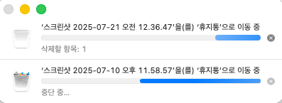 저는 맥북에어 M1 을 사용 중입니다. 갑자기 언젠가부터 파일을 옮기거나 복사 후 붙여넣기, 복제 등을 하면 이동 중임을 표시하는 창과 함께 진행 중이라고만 뜨고, 진전이 없습니다. 그 전까지는 당연히 이런 몇 kb 정도의 파일은 이런 표시도 없이 바로 진행되었는데 말이죠... 파일을 삭제하는 것도 마찬가지입니다. 다만, 휴지통을 비우는 것이나 새로운 폴더를 만드는 등 다른 작업은 잘 진행되는데, 파일을 건드리면 진행이 안 됩니다 ㅠㅠ 어떻게 해결할 수 있을까요?