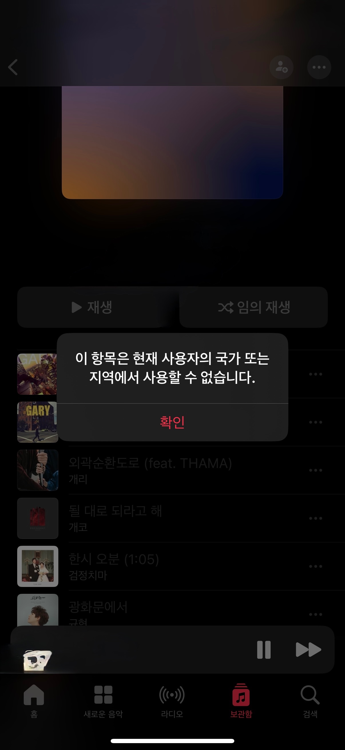 제가 애플뮤직을 계속 구독해놓은 상태인데 갑자기 플레이리스트에 있는 노래를 들으려고 노래를 클릭을 하면 이렇게 뜹니다. 또 플레이리스트에 있는 노래 제목들이 다 흑백처리되어 못듣는것처럼 처리되었습니다. 뭐가 문제인가요?