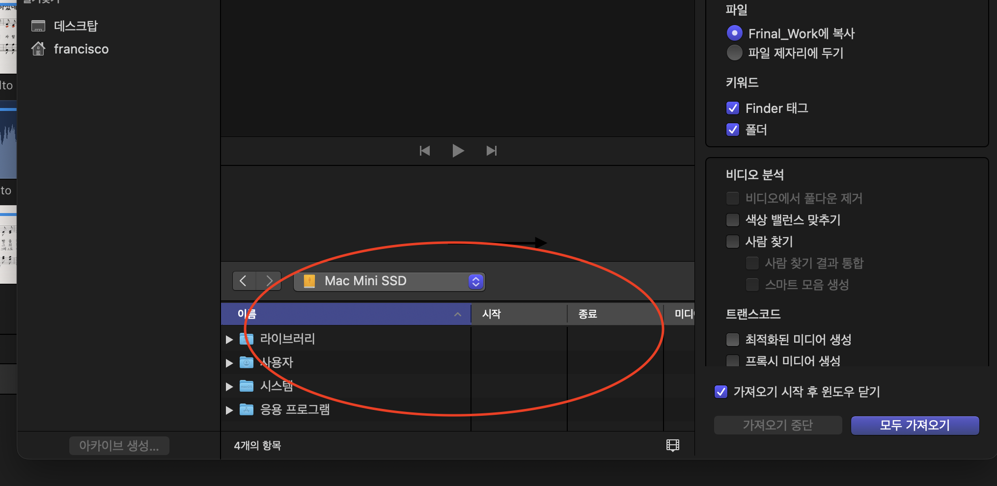 맥미니m4 사용중입니다. 파이널컷 11.2 를 통해 작업중 미디어불러오기 창에서 목록보기창이 조절이 안됩니다.