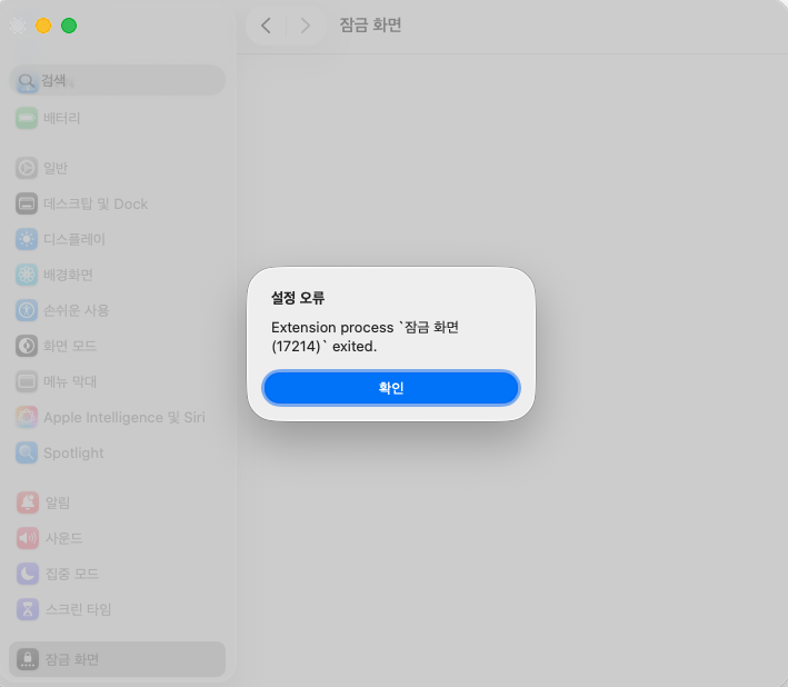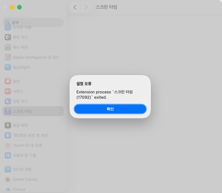MacBook Pro 14에서 Extension Process 잠금 화면, 스크린타임 설정 오류 알림이 뜸