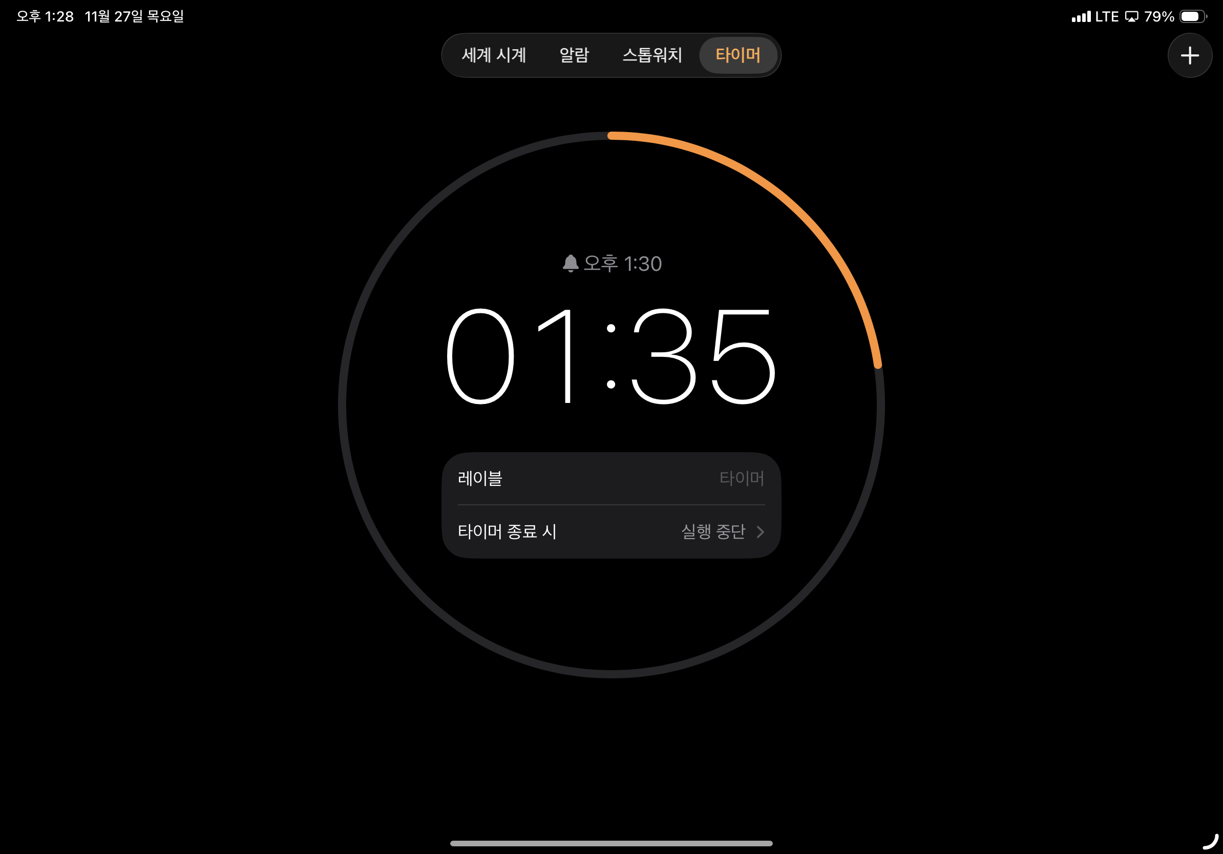 아이패드의 시계 앱에서 타이머를 사용할 때