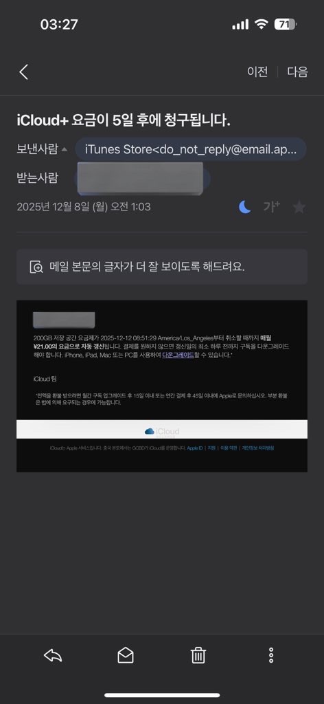 잠시 중국 본토로 설정해둔 사이 iTunes Store에서 첨부된 이미지와 같은 메일이 왔습니다.(메일 확인 시점은 중국 본토에서 다시 대한민국으로 바꾼 뒤이고, 가린 것은 제 메일과 실명입니다.)