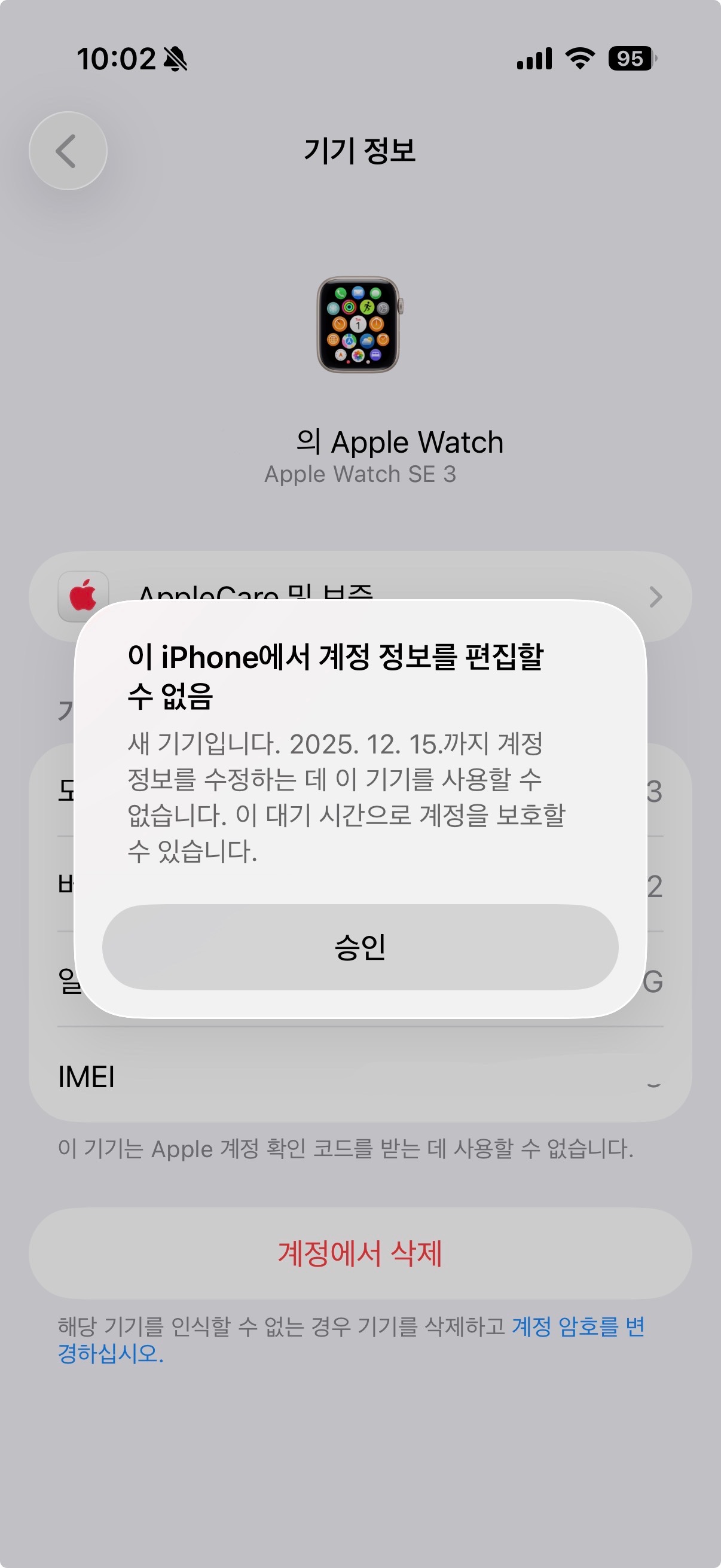 iPhone 도난 당한 기기 보호 기능 중 하나인 보안지연 으로 보입니다. 이는 iPhone 이 새 기기라서, 일정 시점까지 Apple 계정 정보 변경(기기 제거 포함)을 이 iPhone에서 할 수 없다 는 보안 대기 시간 안내입니다. 전원을 초기화, 복원 실패 뒤 새로 로그인한 직후에는 이런 제한이 걸릴 수 있고, 그 시간 동안은 이 iPhone에서 워치를 계정에서 삭제하거나 계정 정보를 수정하는 동작이 막힐 수 있습니다.
