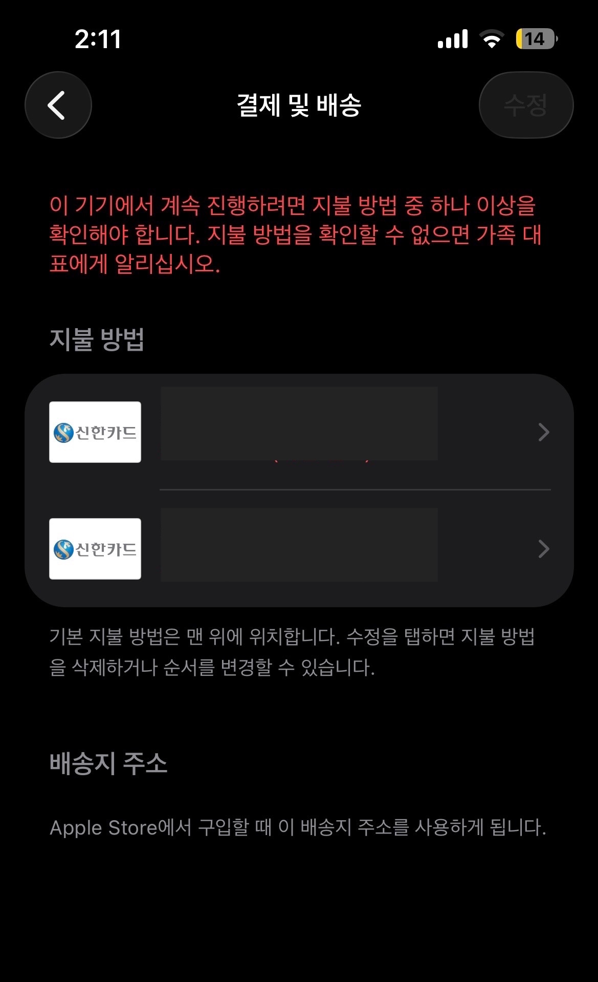 만약 스크린샷의 두 장의 신한카드가 확인필요 상태라면 다른 결제수단을 등록해주시거나, 신한카드 정보를 업데이트 해주시기 바랍니다.