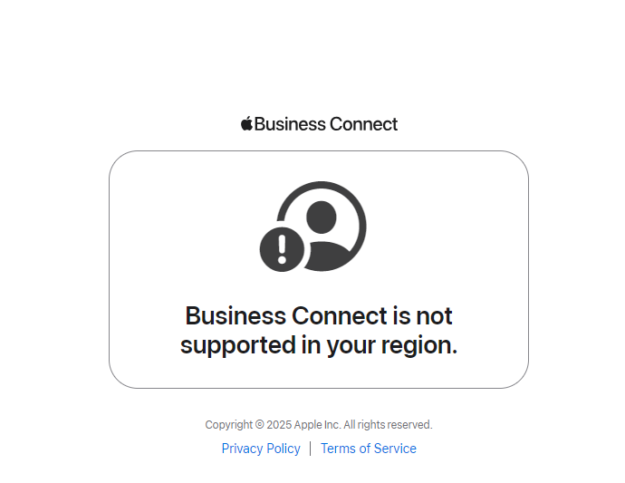 회사 법인에서 운영하고 있는 매장을 애플 지도에 올리고 싶어 비지니스 커넥트라는 기능을 확인하였고 해당 기능을 사용하고 싶은데 게속해서 첨부된 문구가 뜨면서 해당 지역에서는 사용이 안된다고 뜨는데 한국에서 비지니스 커넥트 이용이 어려운건가요?