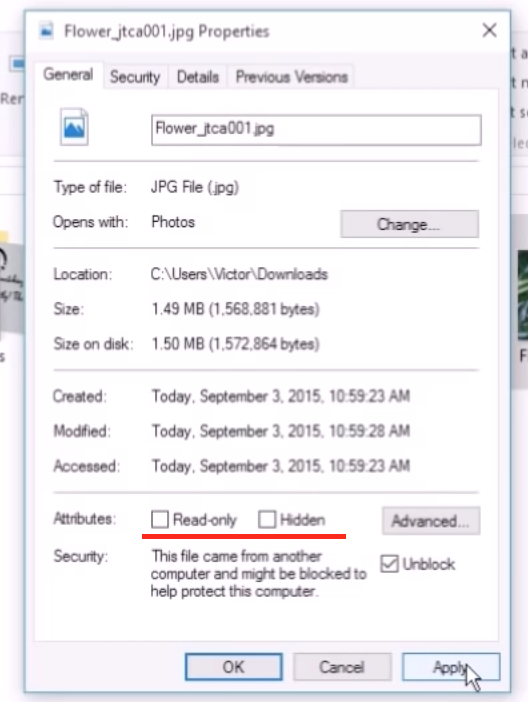 2. 이 때 어떤 파일은(혹은 어디서 그 파일을 가져 왔느냐에 따라 대부분은) 아래 부분에서 "읽기 전용"과 "숨김"에 체크가 되어 있을 겁니다.