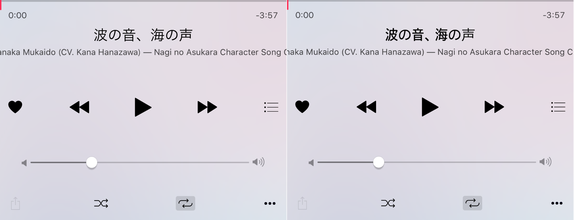 위 사진은 음악 앱에서 일본어 신자체가 들어있는 노래의 이름이 일본어와 한국어 환경에서 각각 다르게 출력되는 상황의 캡처입니다. 왼쪽이 일본어이고 오른쪽이 한국어인데 잘 보시면 굵기와 크기가 다르고 또 한중일 호환 영역의 글자(海)가 다르게 표시되는 것을 알 수 있습니다. 원래 파일 명은 신자체로 입력되었으나 한국어 상황에서 억지로 정체로 바뀌어 나오는 상황입니다.