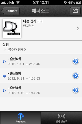 어제 저녁에 wifi 상태에서 팟캐스트를 다운받기 위해 카탈로그로 들어가서 해당 에피소드를 다운로드 했습니다.(나는 꼽사리다 출산 6회, 고전열전 3개)